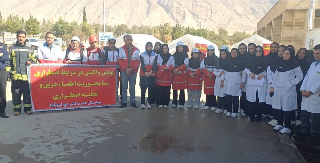 برگزاری پویش واکنش در شرایط اضطراری با محوریت اطفاء حریق و تخلیه اضطراری در بیمارستان قائم(عج) فیروزآباد